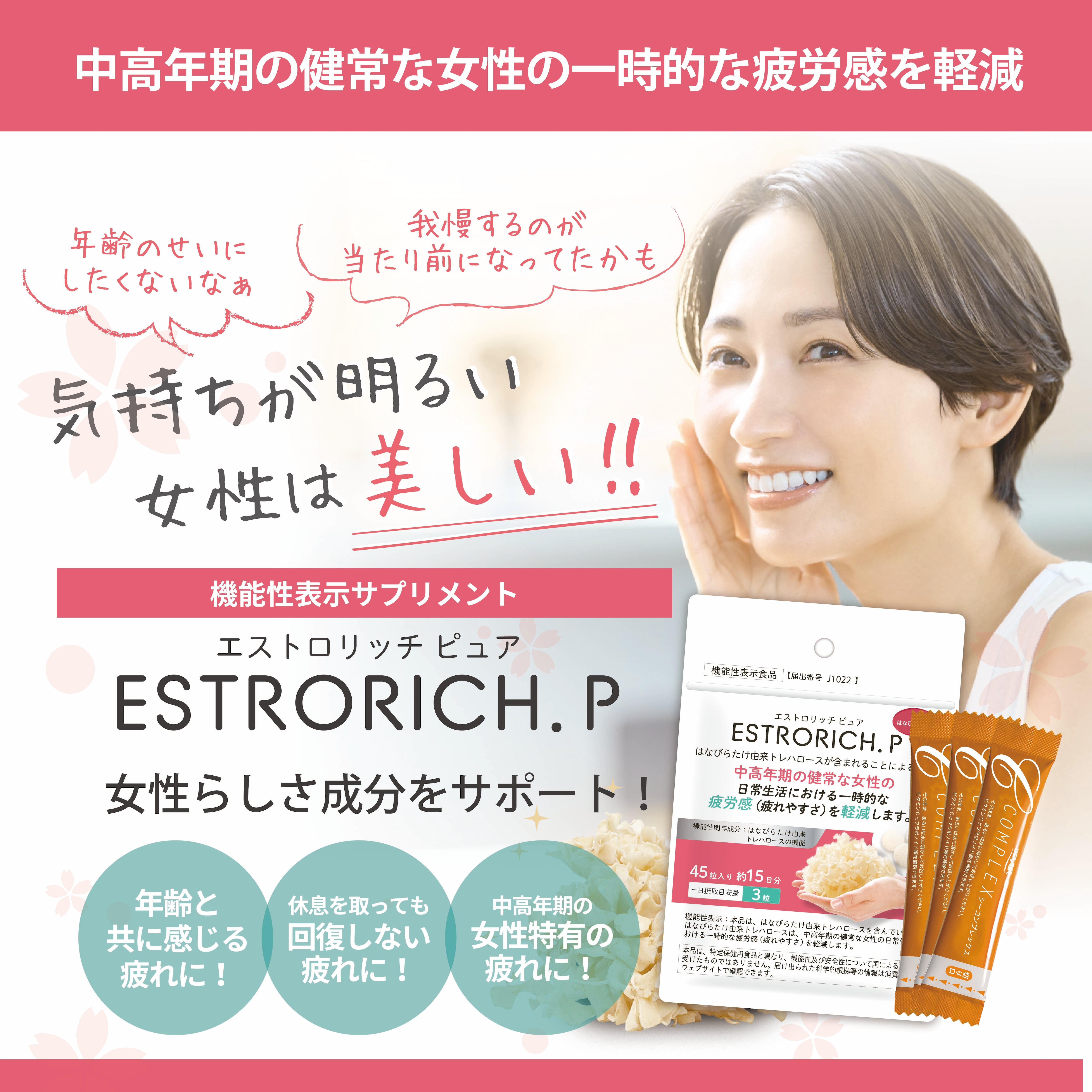 エストロリッチピュアは、更年期の女性のために開発された、疲労感を軽減するサプリメントです。国内工場での厳格な品質管理のもとに生産されており、安心してご利用いただけます。ハナビラタケ由来のトレハロースを使用しており、自然な成分で心身の健康をサポートします。