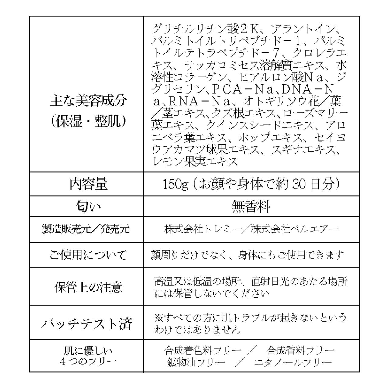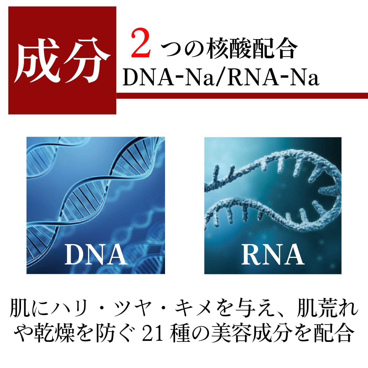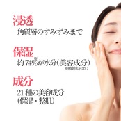 ■ 21種の美容成分 :グリチルリチン酸2K、アラントイン、パルミトイルトリペプチド—1、パルミトイルテトラペプチド—7、クロレラエキス、サッカロミセス溶解質エキス、水溶性コラーゲン、ヒアルロン酸Na、ジグリセリン、PCA-Na、DNA-Na、RNA-Na、オトギリソウ花/葉/茎エキス、クズ根エキス、ローズマリー葉エキス、クインスシードエキス、アロエペラ葉エキス、ホップエキス、セイヨウアカマツ球果エキス、スギナエキス、レモン果実エキス